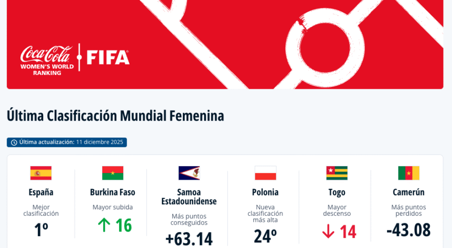 España sigue líder de la Clasificación Mundial Femenina FIFA/Coca-Cola, en cuyo top 10 se han producido bastantes movimientos La actual campeona del mundo se mantiene primera tras levantar el título de la Liga de Naciones Femenina de la UEFA Alemania,…