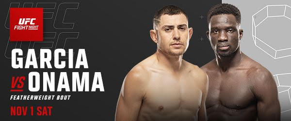 UFC FIGHT NIGHT®: GARCIA vs. ONAMA takes place Saturday, November 1 in Las Vegas and will be available on ESPN+ (English and Spanish). The prelims will air at 1 p.m. PT / 4 p.m. ET, followed by the main card airing at 4 p.m. PT / 7 p.m. ET.