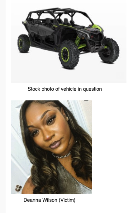 Investigators have identified the vehicle involved as a Can-Am Maverick Sport (four-seater) that appears to be dark gray and neon yellow or green in color. A stock photo of what the vehicle is believed to look like is attached to this news release.
