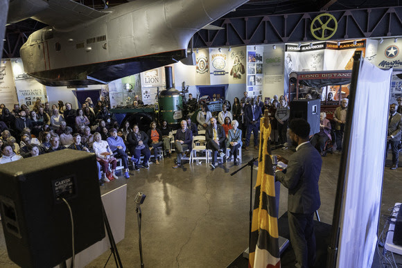 Mayor addresses the crowd at the opening of a key bridge exhibit at the Baltimore Museum of Industry. – Photo by James McQueen. |