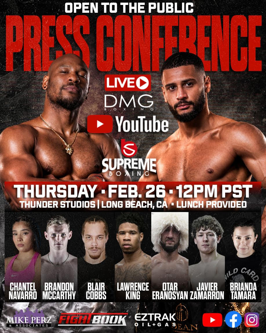 LONG BEACH, CA – February 26 — The countdown to Las Vegas begins in dramatic fashion as DMG Boxing hosts the official Night of Champions X Press Conference, spotlighting the highly anticipated IBF Final Eliminator between Brandon “The Cannon” Adams and Caoimhin Agyarko.