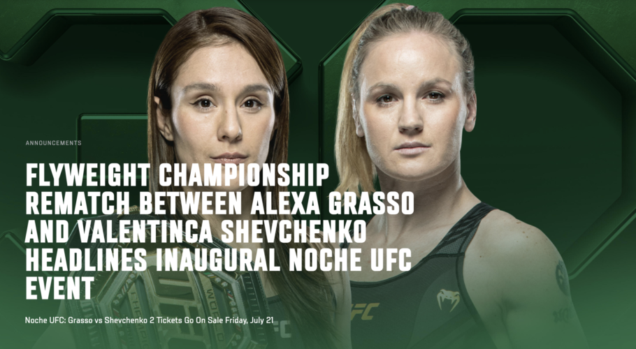 FLYWEIGHT CHAMPIONSHIP REMATCH BETWEEN (C) ALEXA GRASSO AND (#1) VALENTINA SHEVCHENKO HEADLINES INAUGURAL NOCHE UFC EVENT NOCHE UFC: GRASSO vs. SHEVCHENKO 2 TICKETS GO ON SALE FRIDAY, JULY 21 Las Vegas – UFC® brings an action-packed card to T-Mobile Arena…