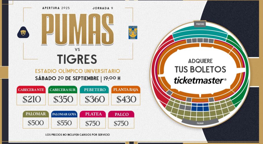 Proximo partido Pumas vs Tigres Auriazules el próximo partido en casa es el sábado 20 de septiembre a las 19:00 horas ante Tigres. Los boletos ya están a la venta en Ticketmaster http://bit.ly/4mLjbvI ¡NOS VEMOS PRONTO! #UnidosPorLaHistoria