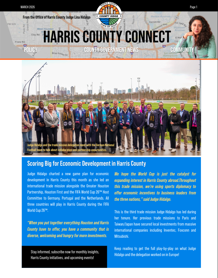 | Judge Hidalgo charted a new game plan for economic development in Harris County this month as she led an international trade mission alongside the Greater Houston Partnership, Houston First and the FIFA World Cup 26™ Host Committee to Germany, Portugal and the Netherlands. All three countries will play in Harris County during the FIFA World Cup 26™.
