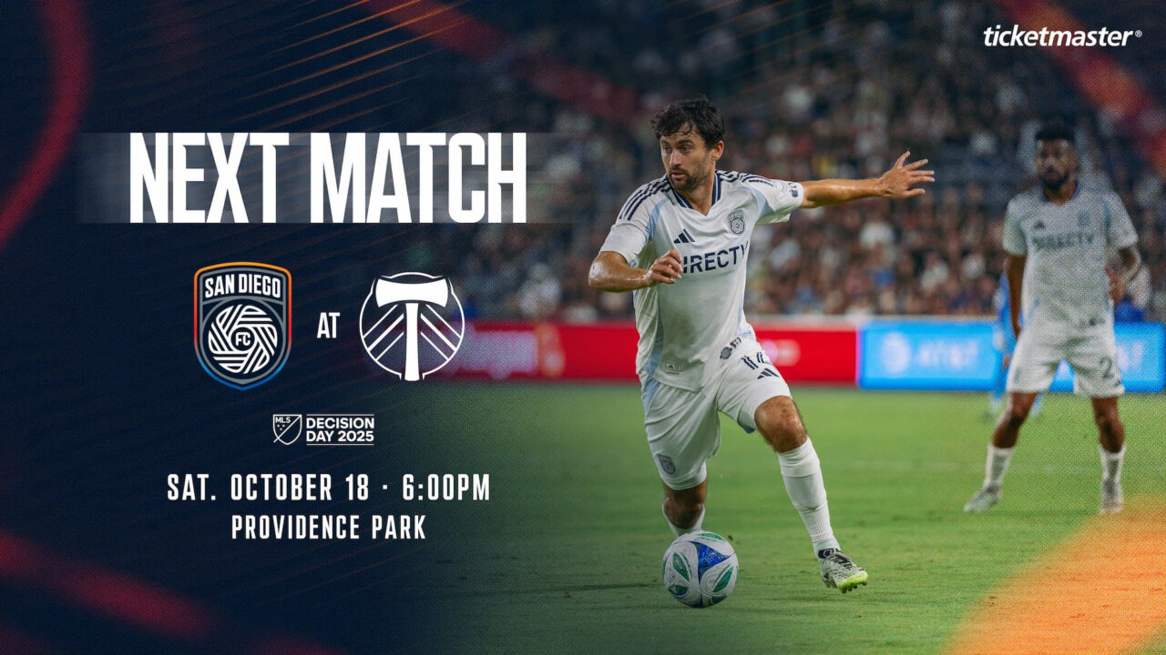 SAN DIEGO (Tuesday, October 7. 2025) – San Diego FC (60 pts, 18-9-6) continues preparations for its first-ever MLS Decision Day matchup to close the 2025 regular season against the Portland Timbers (44 pts, 11-11-11) on Oct. 18 at Providence Park. Kickoff is scheduled for 6:00 p.m. PT, with live coverage available on MLS Season Pass on Apple TV, and radio broadcasts in English on San Diego Sports 760 AM and in Spanish on TUDN 1700 AM.