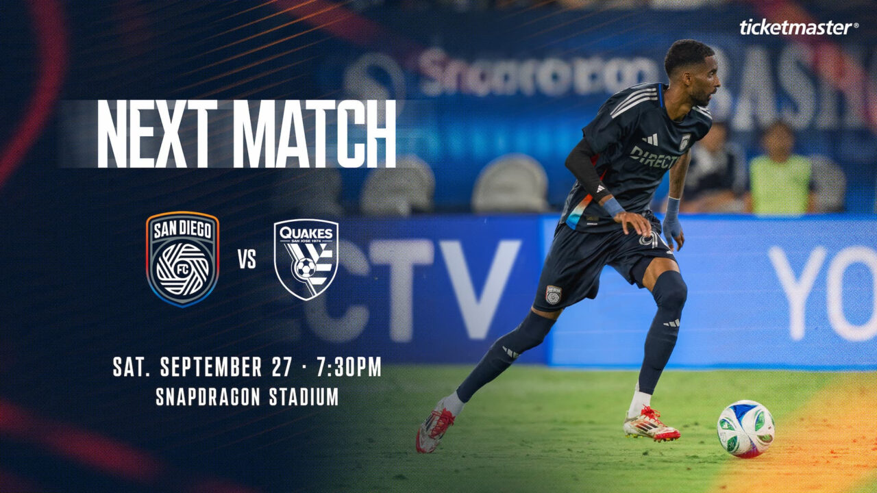 SAN DIEGO (Monday, Sept. 22. 2025) – San Diego FC (57 pts, 17-8-6) host the San Jose Earthquakes (35 pts, 9-14-8) on Fan Appreciation Night in the final 2025 MLS Regular Season home match at Snapdragon Stadium on Saturday, Sept. 27. Kickoff is scheduled for 7:30 p.m. PT, with live coverage available on MLS Season Pass on Apple TV, and radio broadcasts in English on San Diego Sports 760 AM and in Spanish on TUDN 1700 AM.