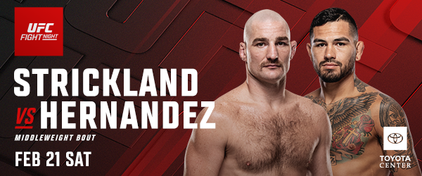 UFC FIGHT NIGHT®: STRICKLAND vs. HERNANDEZ will go on sale Fri., January 9 at 8 a.m. PT / 10 a.m. CT and are available for purchase at AXS.com and ToyotaCenter.com. Ticket sales are limited to eight (8) per person. UFC Fight Club® members will have the opportunity to purchase tickets Wed., January 7 at 8 a.m. PT / 10 a.m. CT via the website www.ufcfightclub.com. A special Internet ticket pre-sale will be available to UFC newsletter subscribers Thurs., January 8 starting at8 a.m. PT / 10 a.m. CT. To access this presale, users must register for the UFC newsletter through UFC.com.