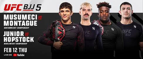 UFC BJJ 5: MUSUMECI vs MONTAGUE takes place Thursday, February 12 and will stream live and free on UFC’s YouTube channel beginning at 8 p.m. ET/5 p.m. PT.